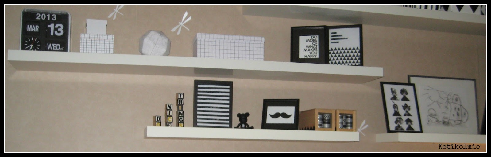 Päätin räpsiä hieman "ennen-kuvia". Mitään kovin radikaalia muutosta ei ole tulossa, mutta jotain pientä päivitystä ja keväisempää ilmettä kaipaa myös olohuoneen hyllyt. Ajattelin ainakin tuunailla vähän tauluja ja yksi pieni hankintakin pitäisi olla jo matkalla meille.